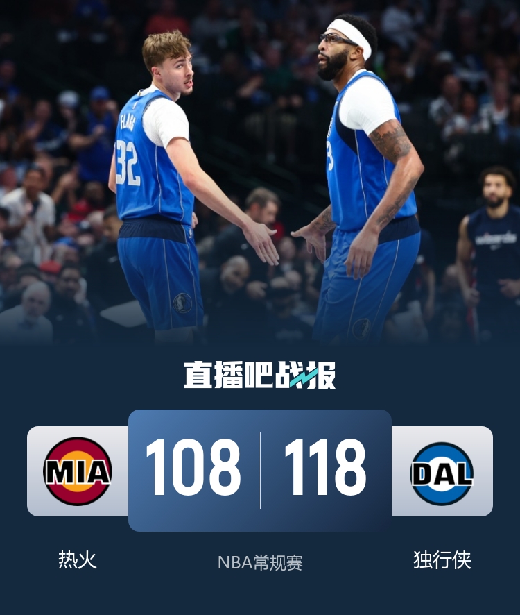 比赛开始,热火反客为主打出10-2开局,弗拉格连投带罚止血,双方展开对攻战,希罗得分上双,克莱连中三分追分,首节热火领先5分,次节双方外线继续对飙,小内姆哈德连续3记三分反超比分,热火断电3分多钟仅得2分,独行侠半场领先10分。下半场,浓眉里扣外投连续取分带队扩大领先,阿德巴约能给出回应,双方围绕着10分左右分差展开拉锯战,末节韦尔里突外投带领热火继续追分,独行侠全民皆兵保持住两球以上领先,最终独行侠118-108击退热火,拿到3连胜。